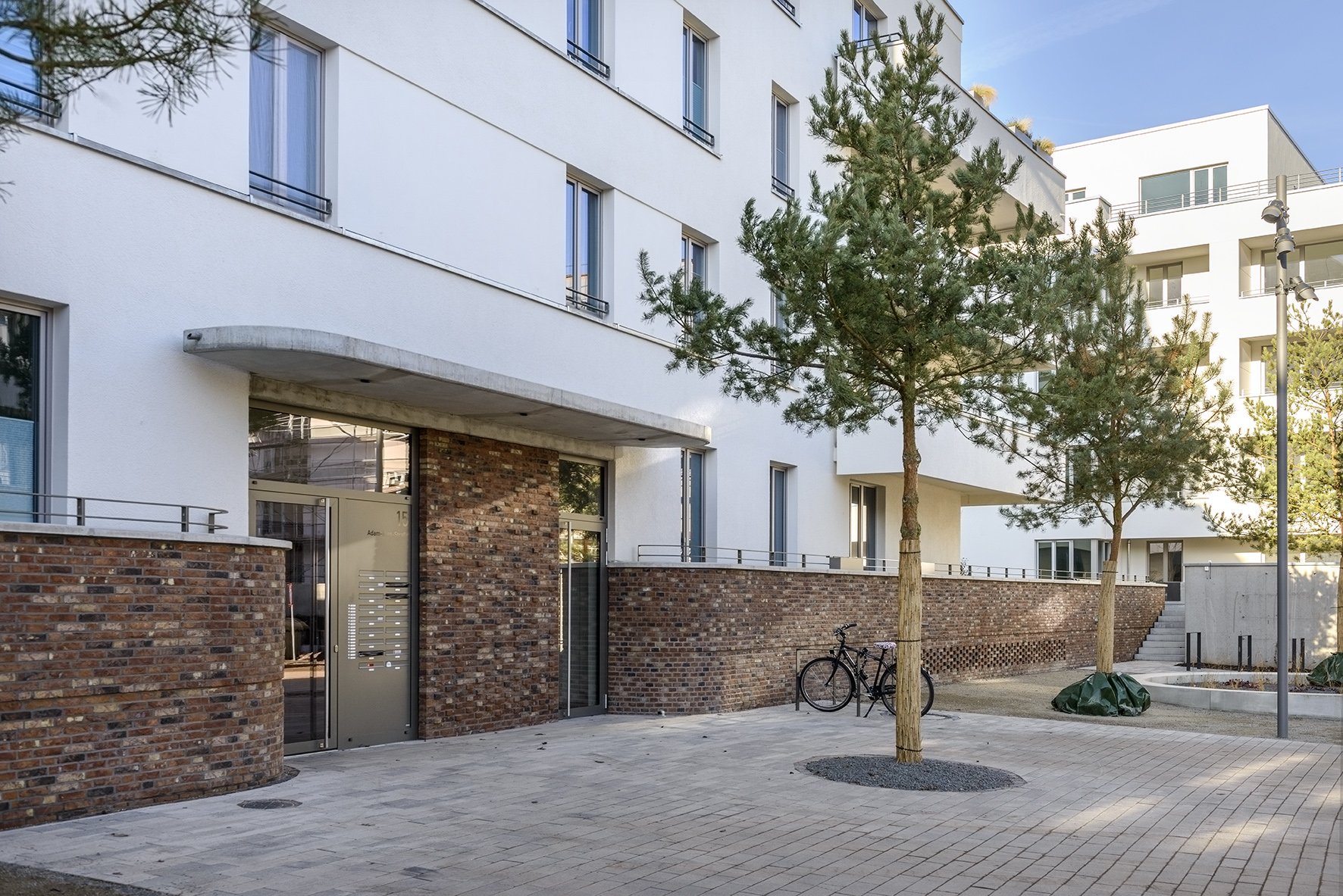 Mit der neuen städtebaulichen Figur des Bogens und der Positionierung der Wohngebäude an einem öffentlich nutzbaren, Fußgängern und Radfahrern vorbehaltenen Anger werden die Siedlungsstrukturen der 1920er Jahre und die gründerzeitlichen Bebauungsreste entlang der Blumenstraße zusammengebunden. Der Anger ist für alle neuen Wohngebäude adressbildend.