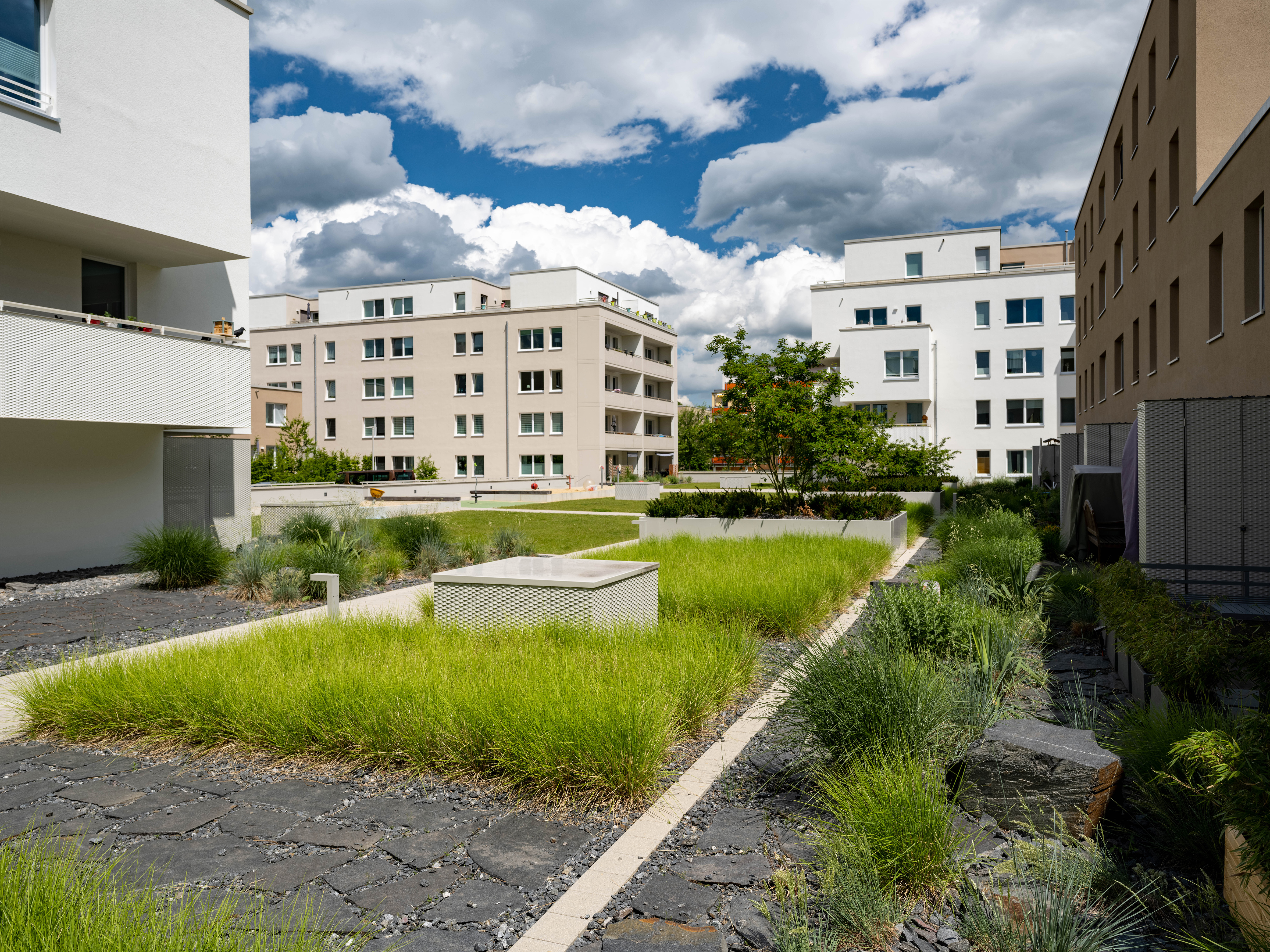 Die Freianlagen des neuen Wohnquartiers schaffen mit einem funktionalen Erschließungssystem- und einer differenzierten Vegetationsstruktur und den gestalterischen Rahmen des gesamten Wohnquartiers. Den einzelnen Zonen der Außenanlagen sind unterschiedliche Aufenthalts-, Spiel- und Funktionsflächen zugeordnet. Ergänzend zum Stellplatzangebot der Tiefgaragen werden zusätzlich 13 oberirdische Stellplätze auf dem Grundstück geschaffen. Das Bauvorhaben untergliedert sich in zwei Bauabschnitte. Bauabschnitt 1 befindet sich im nord-westlichen Bereich des Gesamtgrundstückes (Ecke Merseburger Straße/ Lützerner Straße) Der zweite Bauabschnitt liegt im süd-westlichen Teil (Ecke Lützerner Straße/ Zeitzer Straße).