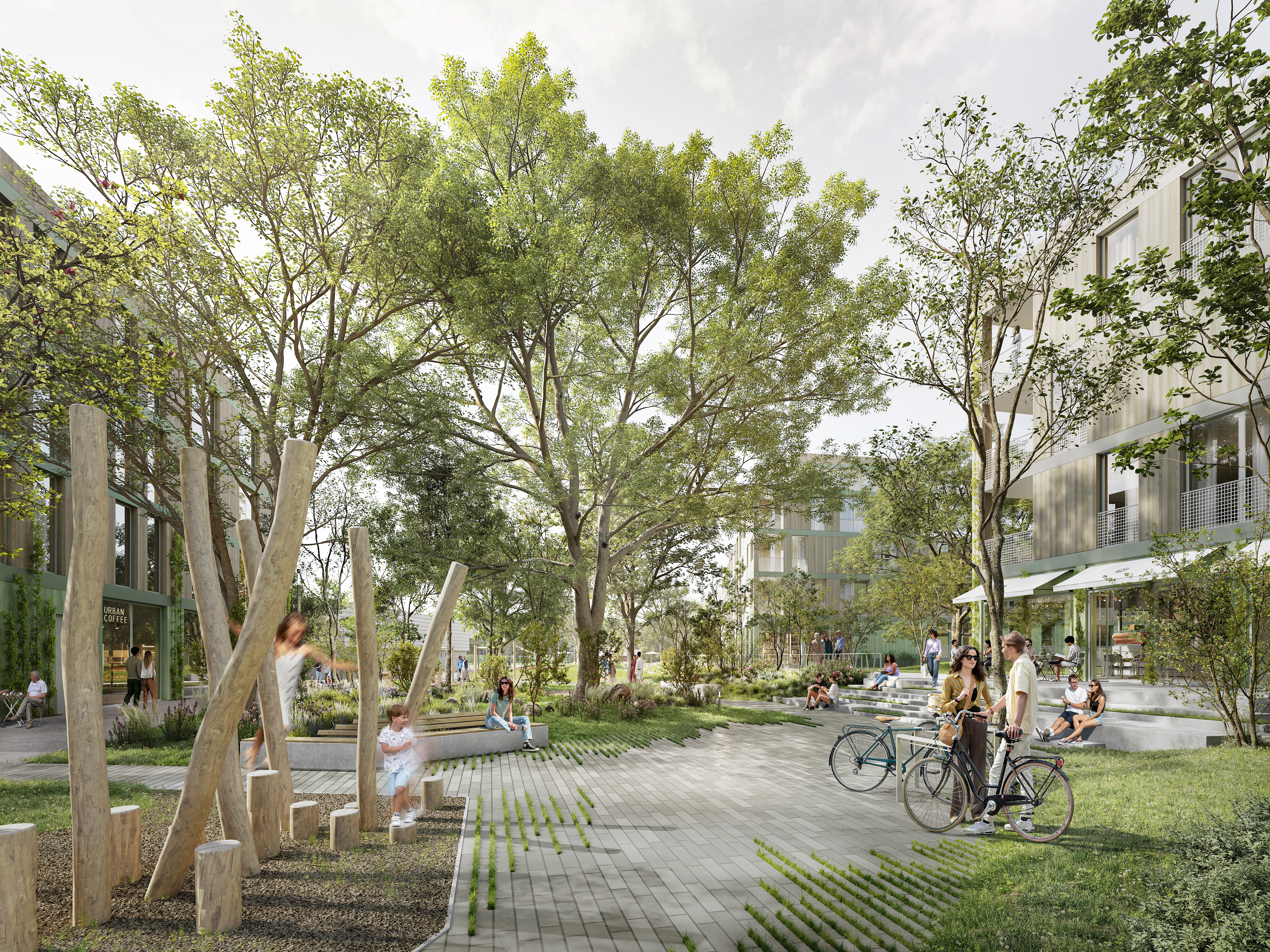 Die Grüne Mitte bildet ein zentrales, klimaresilientes Freiraumsystem zwischen den Wohnquartieren. Breite Wege fassen zwei Plätze, die soziale Begegnung, Aufenthalt und Spiel ermöglichen. Dichte Pflanzflächen, 44 neue Bäume und der Erhalt des Bestands verbessern Mikroklima, Lärmschutz und Aufenthaltsqualität.