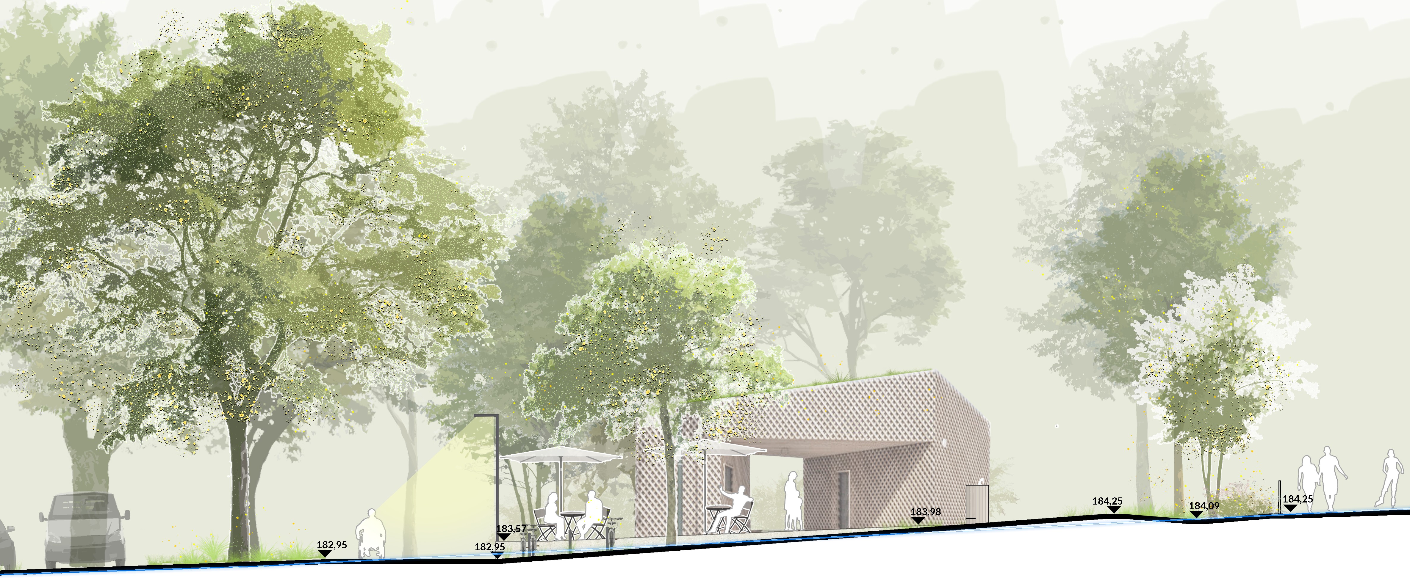 Materialwahl und Ausstattung orientieren sich an Nachhaltigkeit und Robustheit: wasserdurchlässige Beläge, naturnahe Holzelemente, langlebiger Stahl sowie ein mögliches Holzbau-Kiosk mit Dachbegrünung. Ein reduziertes, insektenfreundliches Beleuchtungskonzept minimiert Lichtemissionen.